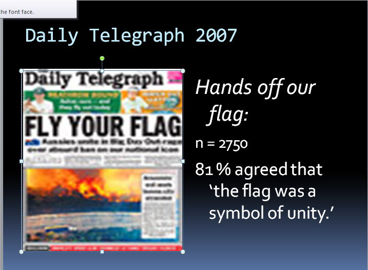 Predictably, Prime Minister (Howard), Opposition leader (Rudd), and Premier (Iemma) all weighed in, against the organisers and for the flag. Of course for these political leaders, the issue was not racists flaunting the flag but their freedom to do so. This also reflects what Dunn (2010) has found and what most Australians know: that there is racism in our communities; and that the political leadership deny (obfuscate, minimalize, distract from) its existence.